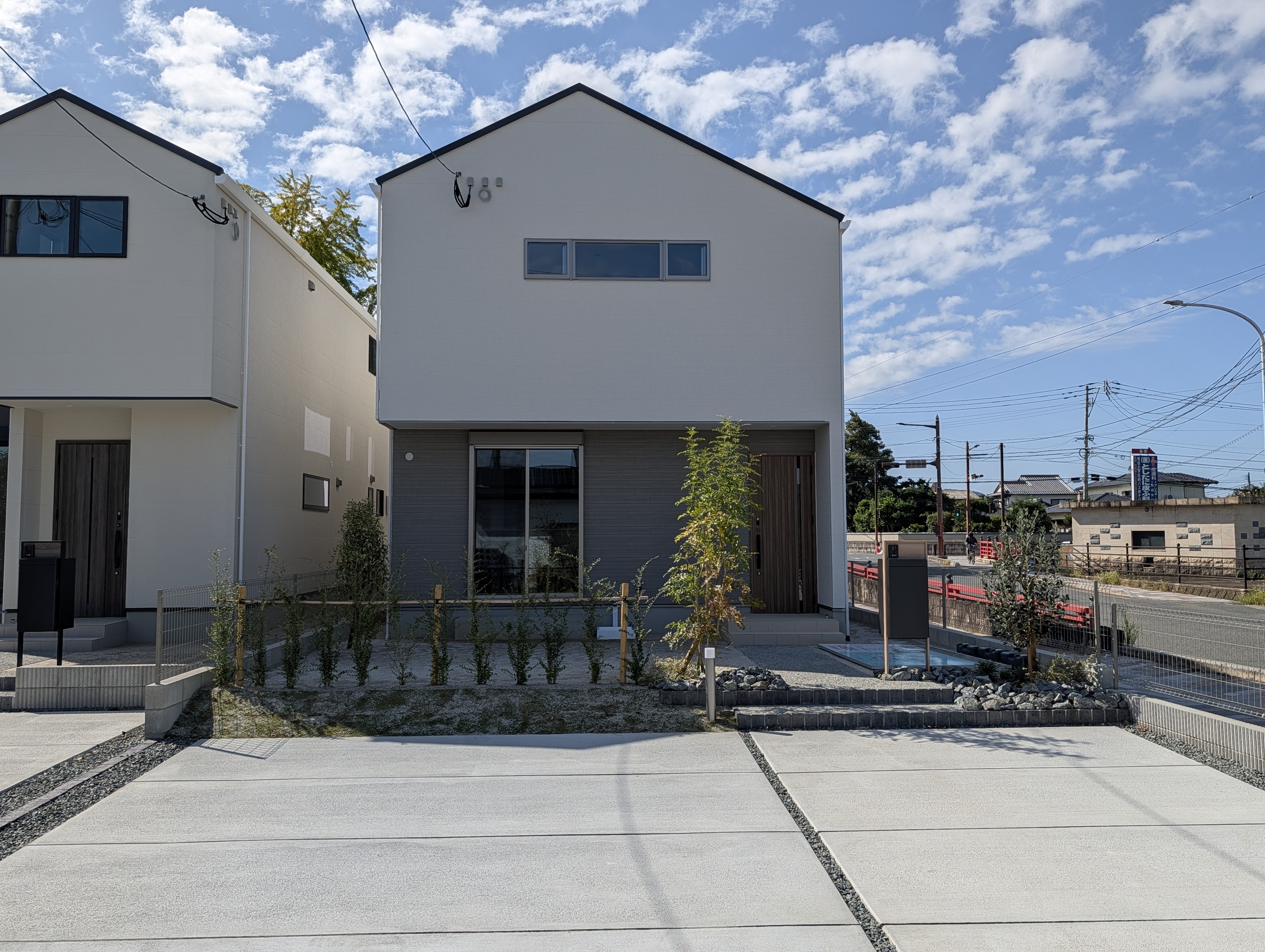 白とグレーのコントラストが美しい、シンプルで飽きのこない外観デザイン。ゆとりのある駐車スペースを確保し、日々の使い勝手にも配慮。