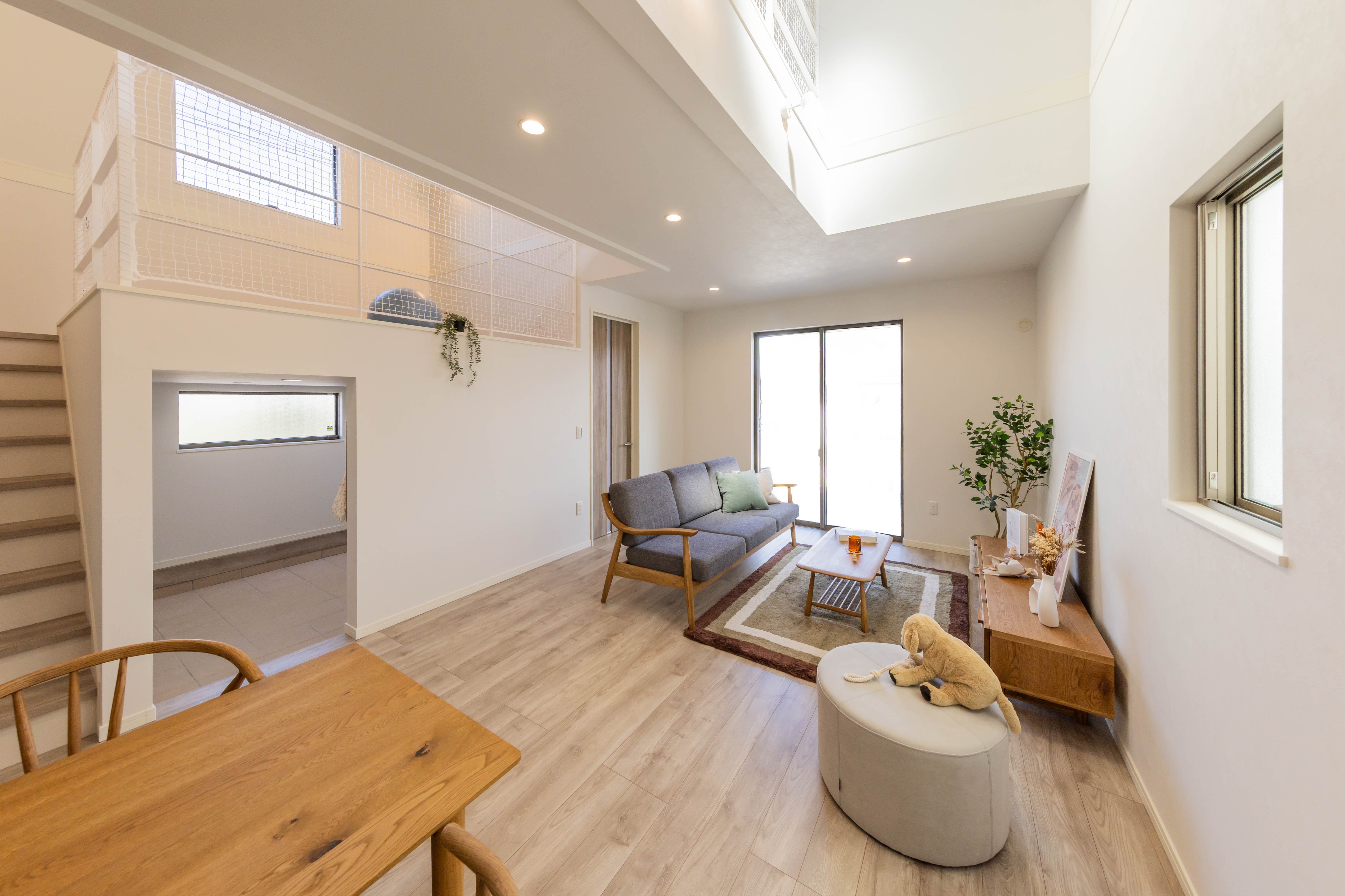やさしい光が差し込むリビングとダイニングは、家族が自然と集まる心地よい空間。