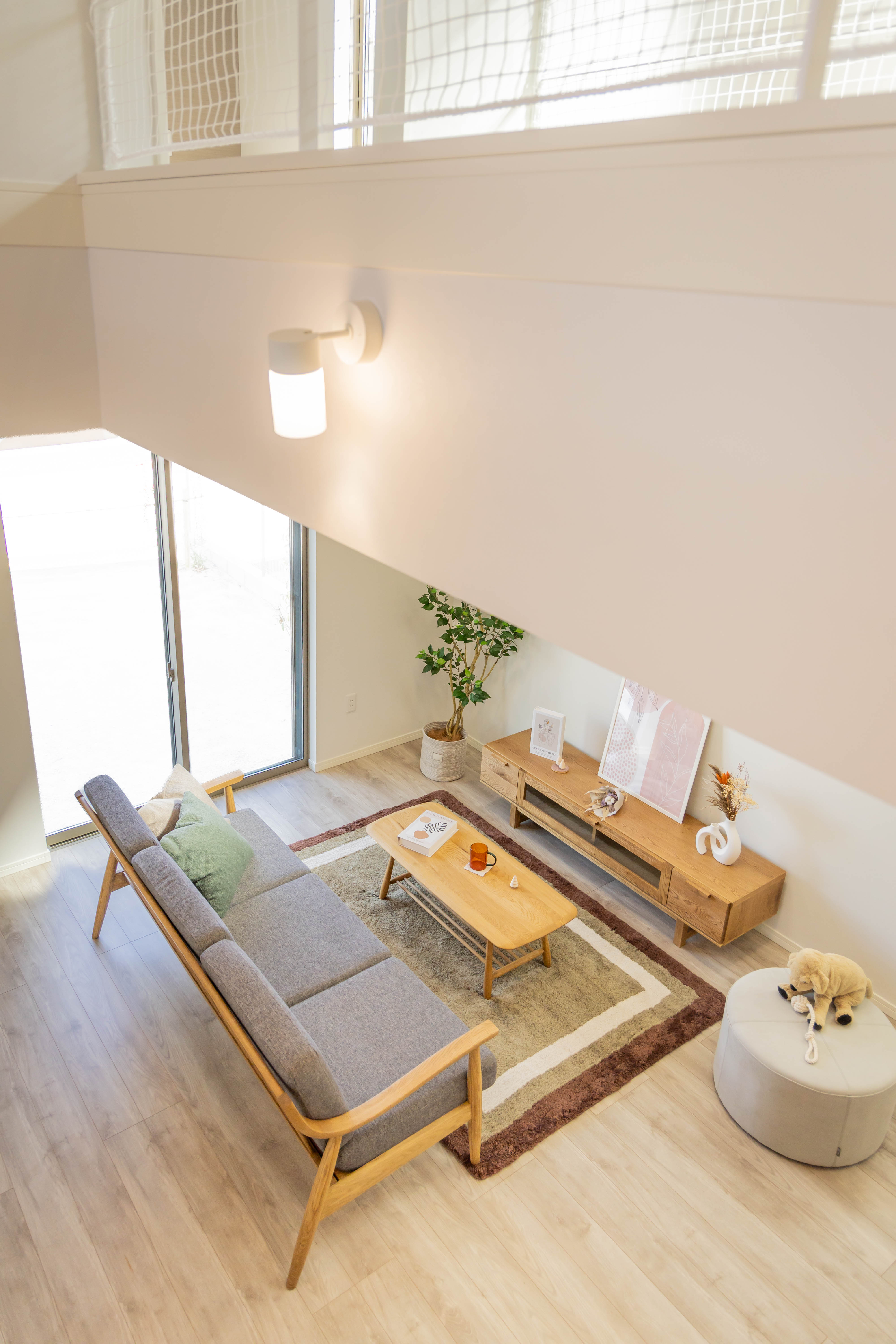 大きな窓と吹き抜けからたっぷりと光が差し込む、明るく開放的なリビング。