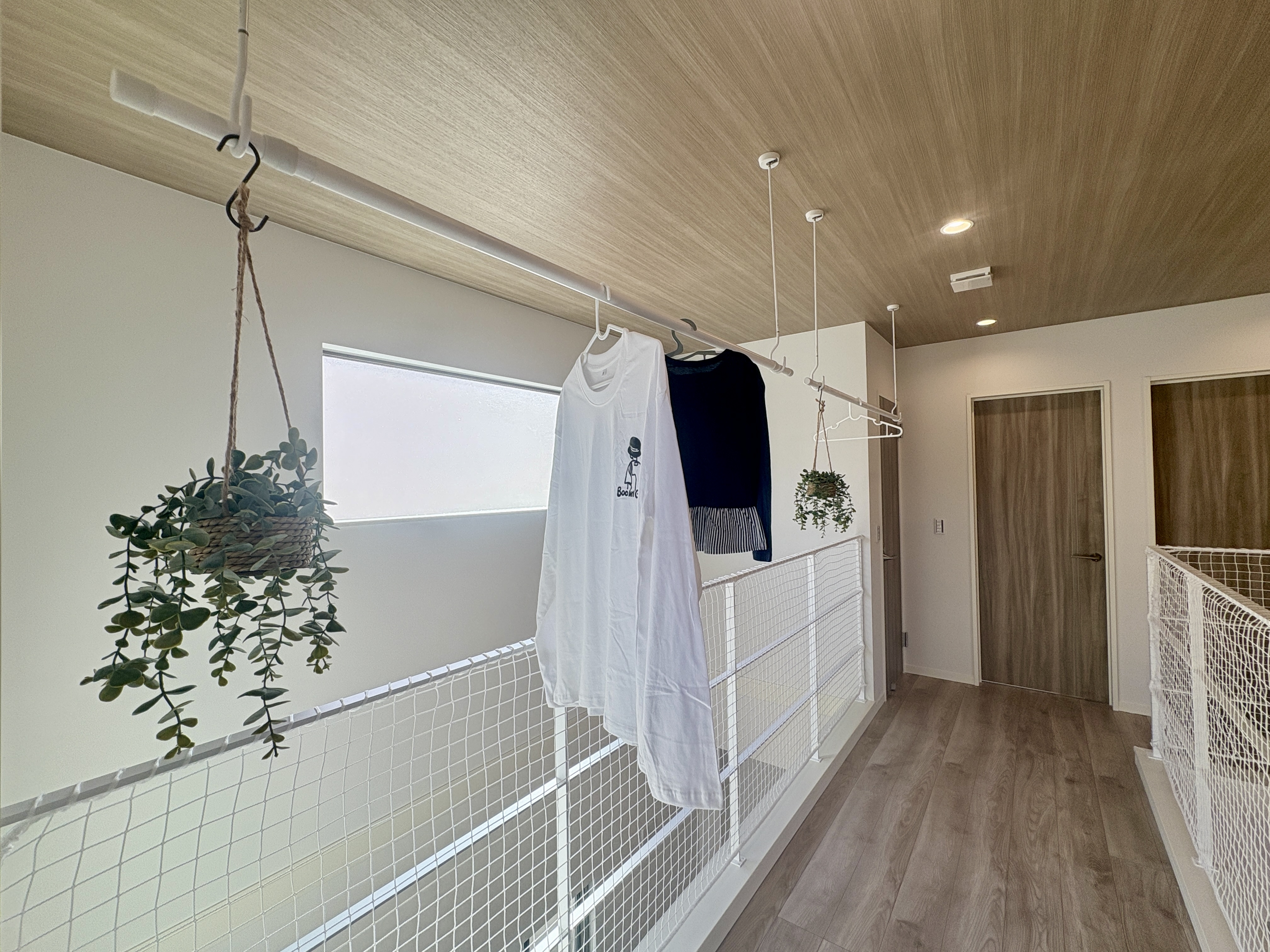 2階ホールにスライド式の物干しを設置し、室内でも効率よく洗濯物を干せる空間を確保しました。