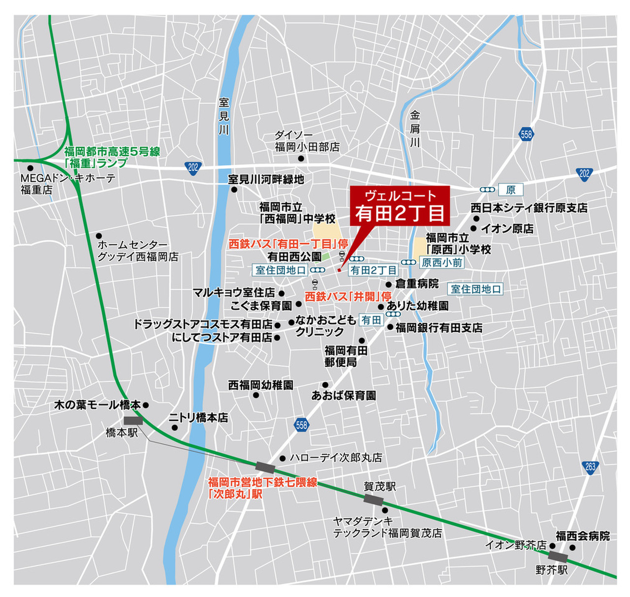 - 福岡市地下鉄七隈線「次郎丸」駅自転車約8分(1800m)